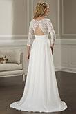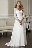 IN STOCK IN IVORY, SIZE 28. YES, WE ALSO HAVE LAYAWAY. IT’S 1/3 DOWN. GET A GREAT DRESS NOW AND MAKE YOUR ALTERATION APPOINTMENT WHILE YOU CAN GET ONE. WE’LL HELP WITH THAT TOO. This lace bodice dress features a v neckline and 3/4 length sleeve. The back bodice has a keyhole detail and is sheer. The waist band and skirt are made of chiffon and the skirt has a sweep train