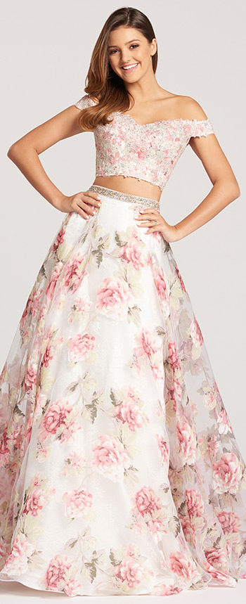 NOW MARKED DOWN 50%. IN STOCK IN A PURPLE MULTI, SIZE 10. IMAGE SHOWN IS THE PINK MULTI. Two-piece off-the-shoulder metallic lace, printed burnout organza, and lace full A-line gown with lace edged sweetheart neckline. Bodice is covered in lace and metallic lace and features a lace edged bottom that ends at the high waist to expose the midriff. High-waisted skirt features beaded waistband while the floral printed organza flows over the hips and billows into a full skirt with a sweep train. In stock in purple multi. Image shown is in the pink multi, which is no longer in stock. The finishing touches are a pair of matching purple, clear , or iridescent earrings and perhaps comfortable silver heels, to make all this POP ! TAKE AN ADDITIONAL 15% DISCOUNT ON ALL JEWELRY AND SHOES IF PURCHASED WITH THE DRESS. CAROLS OF DANVILLE IS PROM HEADQUARTERS !